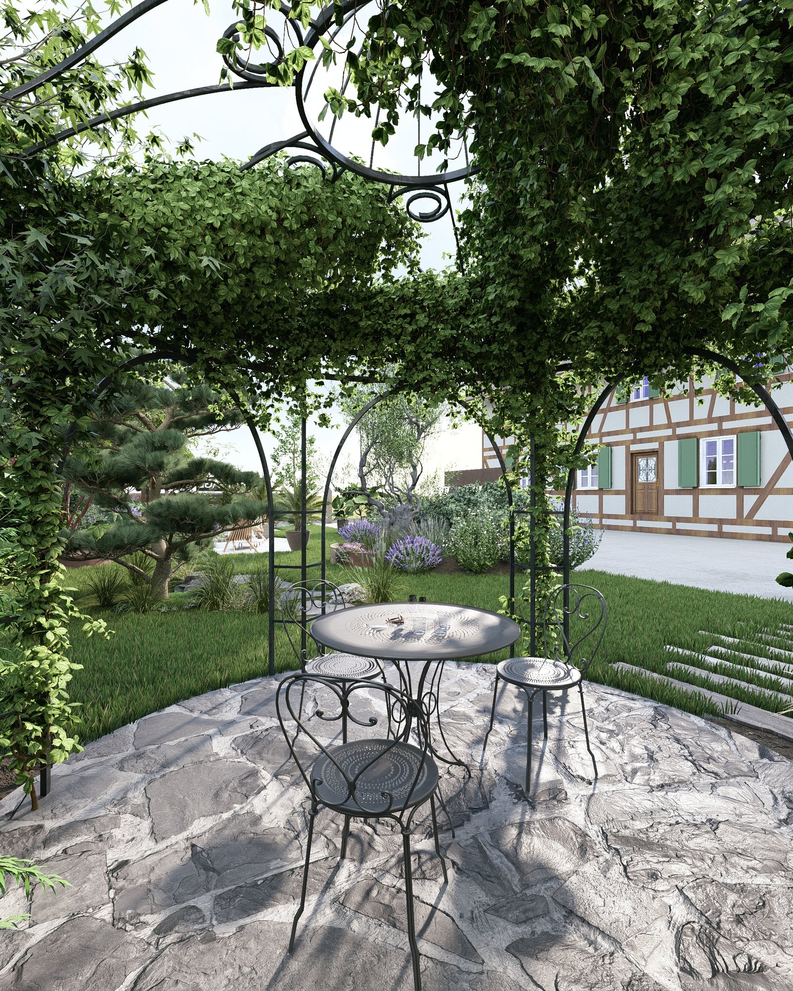 une pergola en ferronnerie d’art entièrement végétalisée, ombrage naturel sur dallage pierre ;