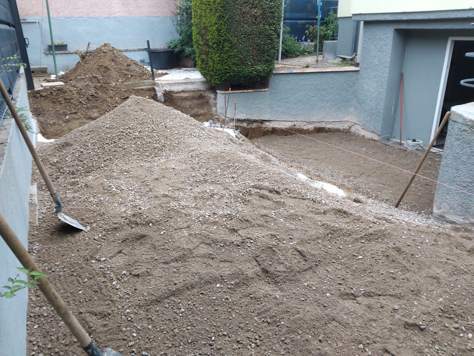 La première phase a consisté à retirer chaque mètre carré de béton fissuré et à évacuer des mètres cubes de remblais entassés au fil du temps. Sous cette dalle, le sol s’avérait meuble ; nous l’avons remplacé par une grave 0/31,5 déposée en couches régulières et compactée à la plaque vibrante. Un laser rotatif a piloté la mise à niveau afin d’obtenir une pente de 1 % menant vers un caniveau discret : cette pente garantit que l’eau de pluie ne stagne jamais, condition indispensable avant l’installation d’un gazon synthétique ou d’un ouvrage maçonné durable.