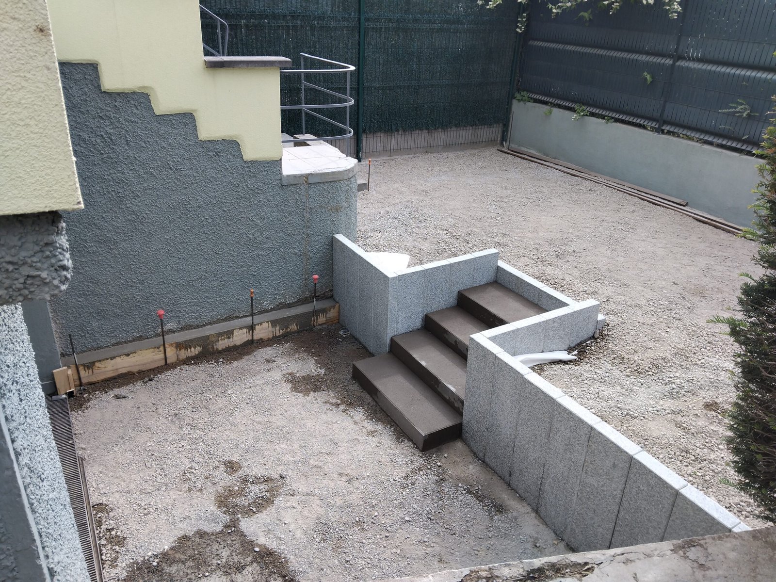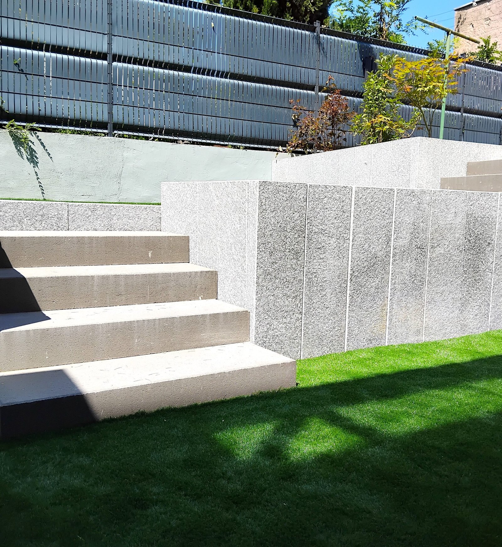 Pour lier les terrasses fraîchement créées, nous avons coffré et coulé sur place un escalier béton teinté dans la masse. Ses marches, classées R11 pour l’adhérence, arborent un nez subtilement arrondi ; la teinte taupe, obtenue directement au malaxage, offre un contraste doux avec la froideur du granit. Un garde-corps en acier laqué noir, volontairement épuré, sécurise la descente sans casser la perspective. L’ensemble compose une ligne continue qui guide le regard autant que le pas.