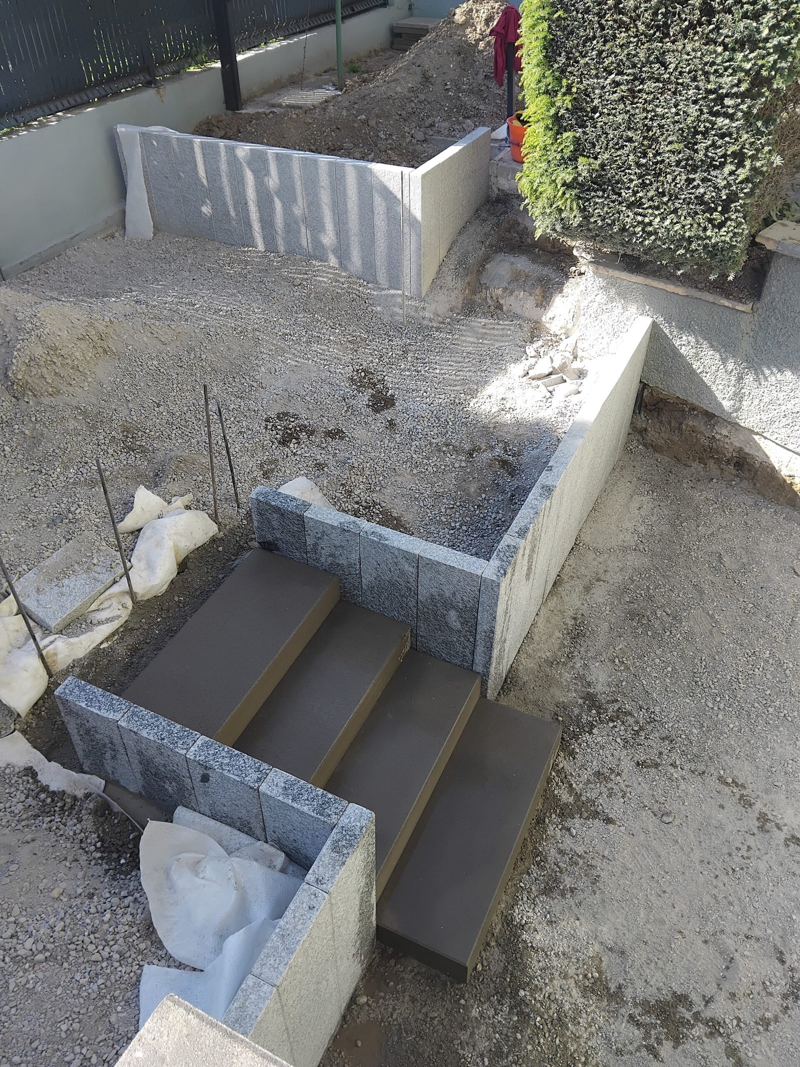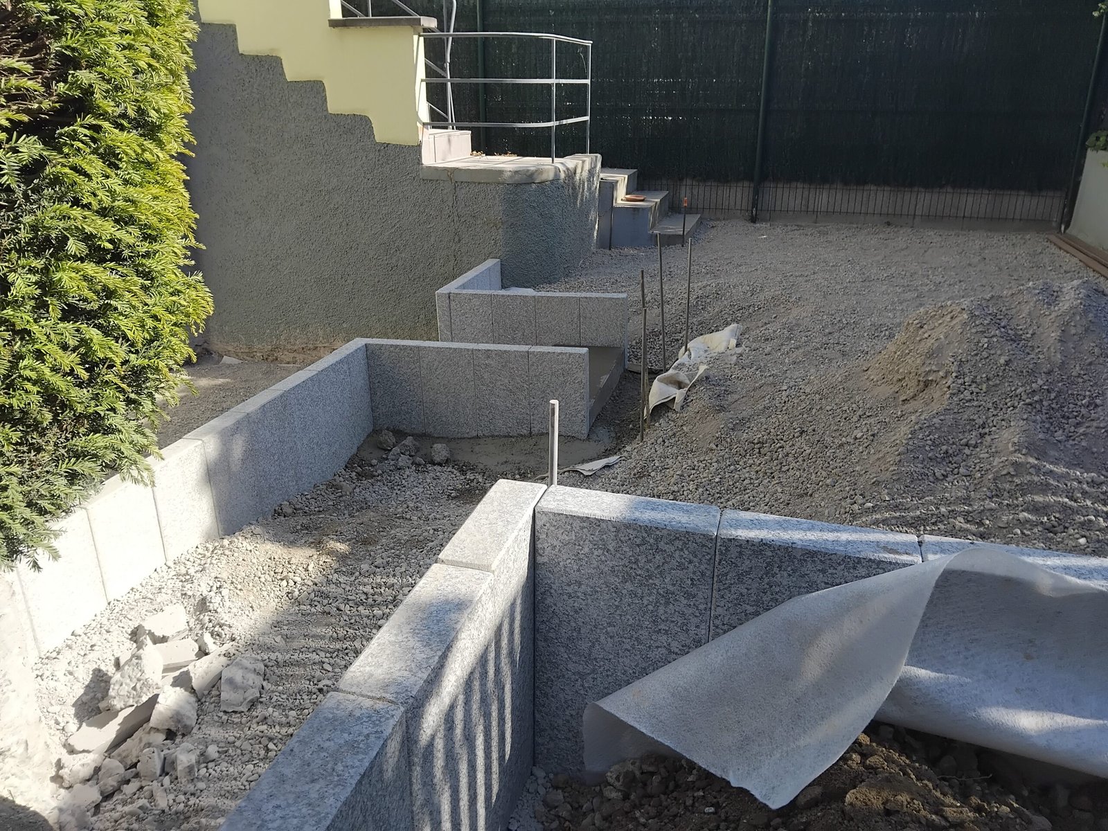 Une fois le fond de forme parfaitement stabilisé, place aux murs : des palissades en granit grenaillé, format 80 × 35 × 12 cm, posées sur une longrine béton drainant. Chaque bloc est ancré par tiges filetées galvanisées, tandis qu’un drain agricole gainé, noyé dans un lit de gravier, se dissimule derrière la pierre afin d’évacuer la moindre infiltration. Le granit grenaillé, légèrement rugueux au toucher, accroche la lumière sans briller ; sa nuance gris perle dialogue avec la façade et sert d’écrin minéral aux futures plantations.