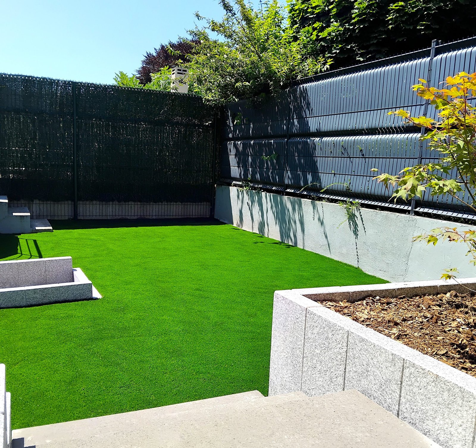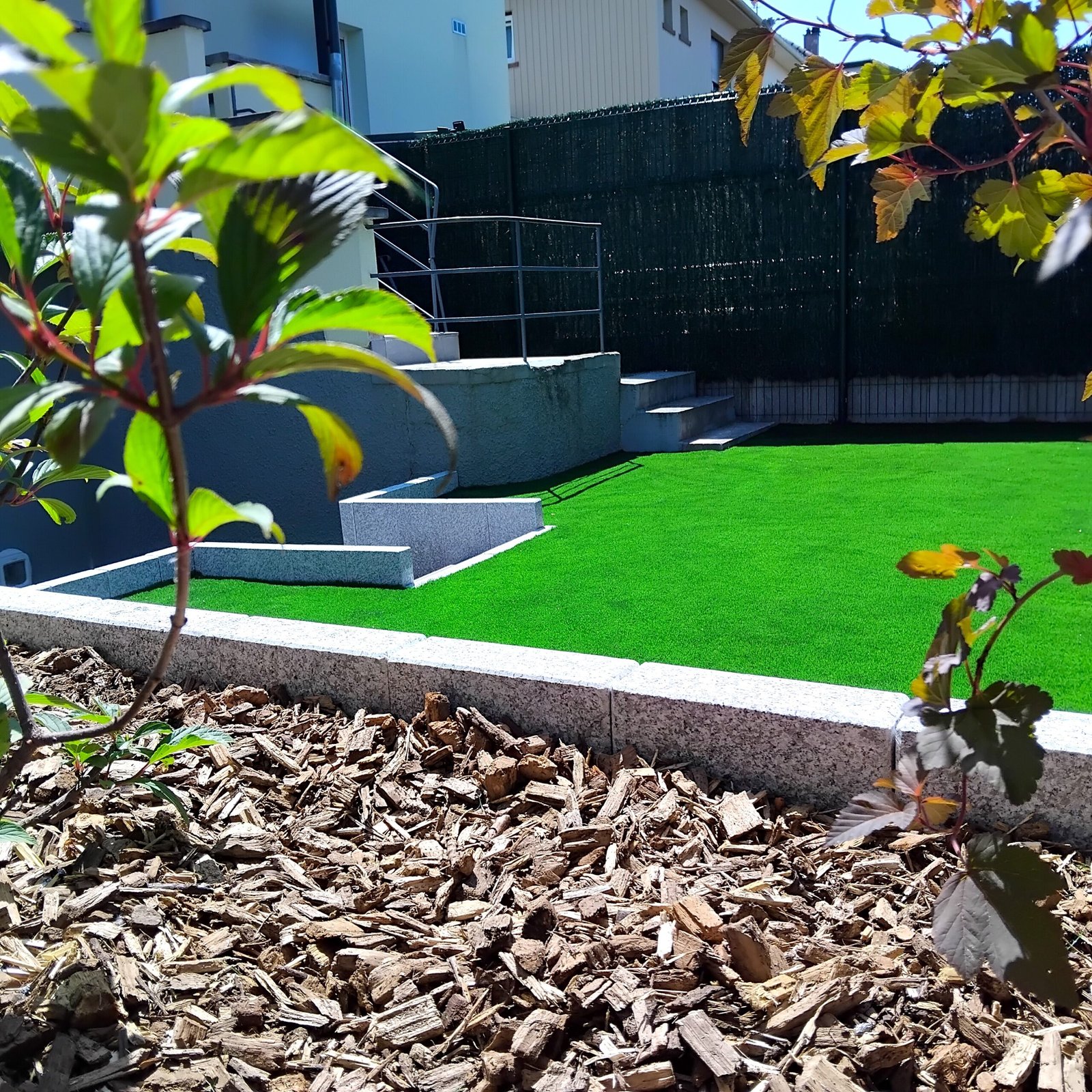 Un dallage béton lézardé, des talus instables, un accès si étroit qu’aucun engin motorisé ne pouvait franchir le portillon : voilà le défi que nous avons découvert derrière la maison. Les propriétaires ne voulaient plus d’un simple espace technique où l’on entrepose les poubelles. Ils rêvaient d’un salon extérieur contemporain, verdoyant douze mois sur douze et surtout libéré des corvées de tonte. Pour y parvenir, nous avons imaginé une création minérale : des palissades en granit pour asseoir le terrain, un escalier monolithique pour relier les niveaux, un gazon synthétique haute densité pour l’effet pelouse parfaite et une palette végétale graphique pour réchauffer l’ensemble.
