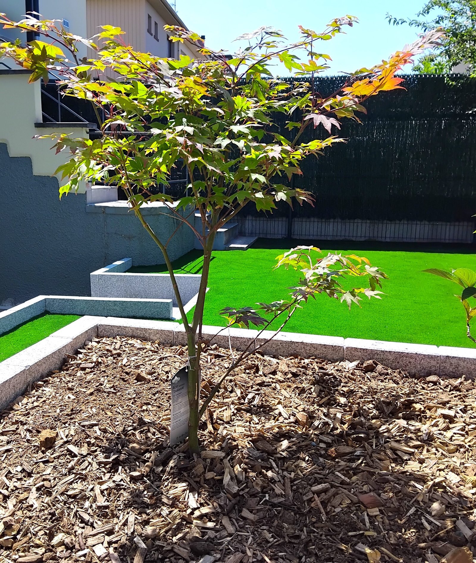 La minéralité, aussi raffinée soit-elle, méritait une respiration végétale. Nous avons donc façonné deux bacs en granit assorti aux palissades et les avons garnis d’un substrat léger enrichi en compost. Dans le premier trône un érable japonais ‘Summer Gold’ ; son feuillage chartreuse, virant cuivré en automne, capte la lumière comme un vitrail naturel. Autour de lui, des plumeaux de Pennisetum ‘Hameln’, la brume parfumée d’une Nepeta faassenii et le feuillage chocolat d’un Physocarpus pourpre créent un tableau de contrastes subtils. Le tout est protégé par un paillage BRF local, à la fois isolant et nourrissant, qui souligne la teinte du granit et limite l’évaporation.